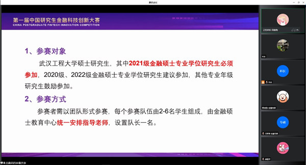 (通讯员 田嘉莉)为推动金融科技领域创新人才培养,提升金沙信心之选官网金融专业学位研究生的实践创新能力,6月20日上午,学校金融硕士(MF)教育中心组织召开第一届研究生金融科技创新大赛线上动员会。4166am金沙信心之选副院长付书科、金融硕士(MF)教育中心副主任田嘉莉、2021级金融硕士专业班主任王祥礼、2020级-2022级金融硕士研究生参加此次动员会,会议由副院长付书科主持。