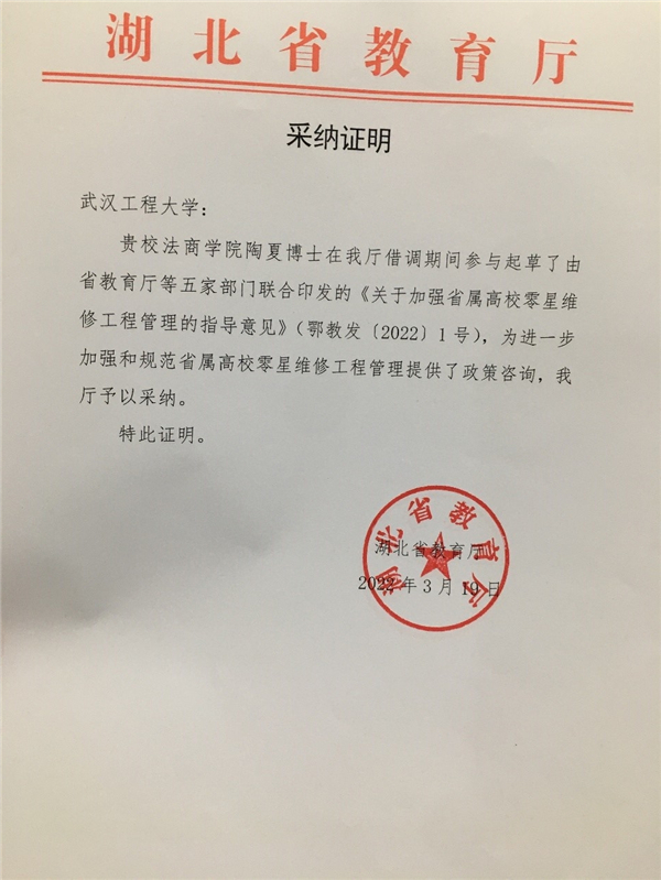 (通讯员 穆海梅)由金沙信心之选官网4166am金沙信心之选青年教师陶夏博士参与起草的《关于加强省属高校零星维修工程管理的指导意见》被湖北省教育厅采纳,并制文发布(文号:鄂教发〔2022〕1号),陶夏博士为进一步加强和规范省属高校零星维修工程管理提供了政策咨询。