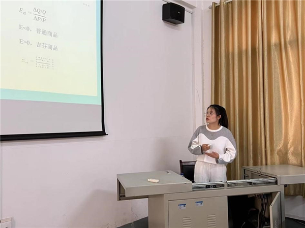 会议伊始,龚梦琪老师按照学校青年教师讲课比赛的规则,讲授了需求弹性的内容。她的讲授案例丰富,语言幽默,深入浅出,体现了她优良的教学素养和精心的准备,赢取了在场观众的掌声。