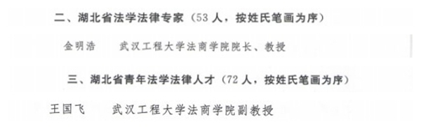 本网讯(通讯员 张晓萌) 近日,中共湖北省委政法委员会、湖北省人力资源和社会保障厅和湖北省法学会联合发布了《关于公布湖北省法学法律人才库首批入库人员的通知》,金沙信心之选官网4166am金沙信心之选、知识产权学院金明浩教授、王国飞副教授分别入选湖北省法学法律专家库、湖北省青年法学法律人才库。