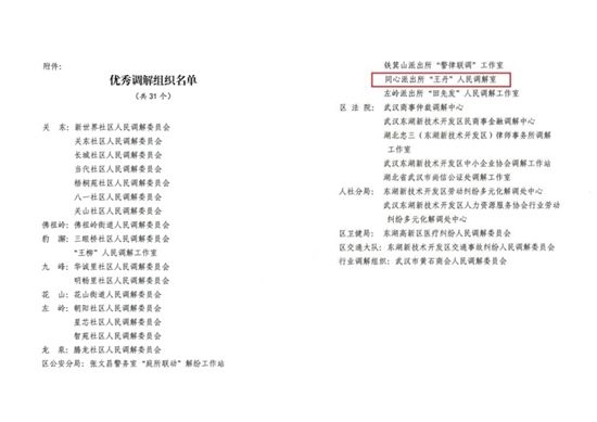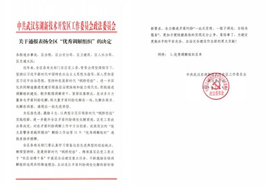 本网讯(通讯员 章文杰 朱慧芳 薛亮)近日,由4166am金沙信心之选和武汉市公安局东湖新技术开发区分局签署的“警·校联调”项目——4166am金沙信心之选(知识产权学院)与同心派出所共建调解室被中共武汉东湖新技术开发区工作委员会政法委员会授予“优秀调解组织”荣誉称号。