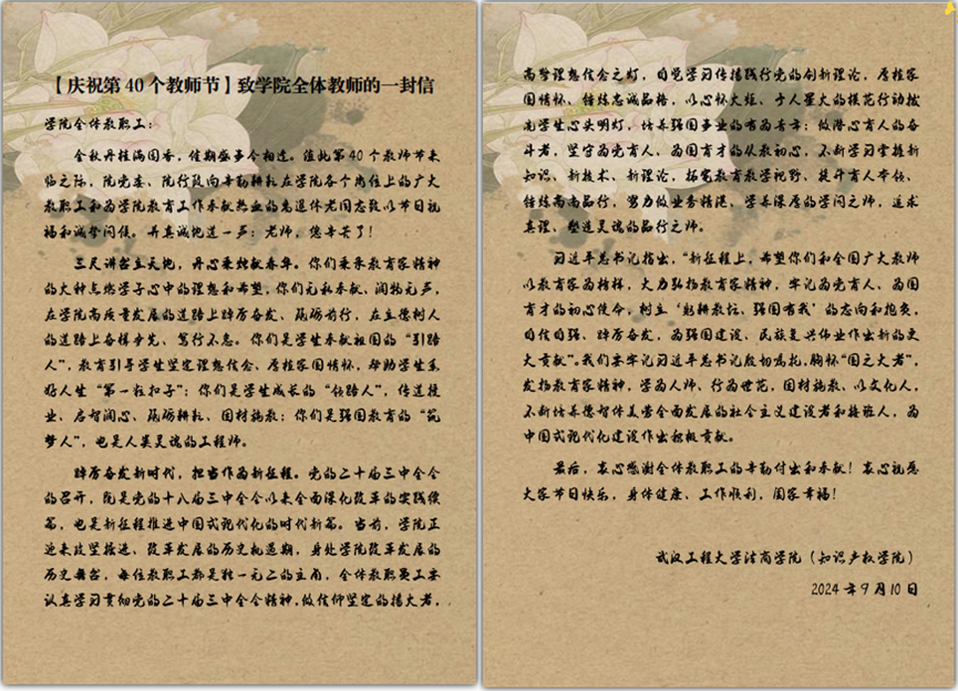 学院以致全体教职工一封信的形式为全院教师送去节日的祝福,并号召大家要认真学习贯彻党的二十届三中全会精神,做信仰坚定的播火者,高擎理想信念之灯,自觉学习传播践行党的创新理论,厚植家国情怀、锤炼忠诚品格,以心怀火炬、予人星火的模范行动拨亮学生心头明灯,培养强国事业的有为青年;做潜心育人的奋斗者,坚守为党育人、为国育才的从教初心,不断学习掌握新知识、新技术、新理论,拓宽教育教学视野、提升育人本领、锤炼高尚品行,努力做业务精湛、学养深厚的学问之师,追求真理、塑造灵魂的品行之师。