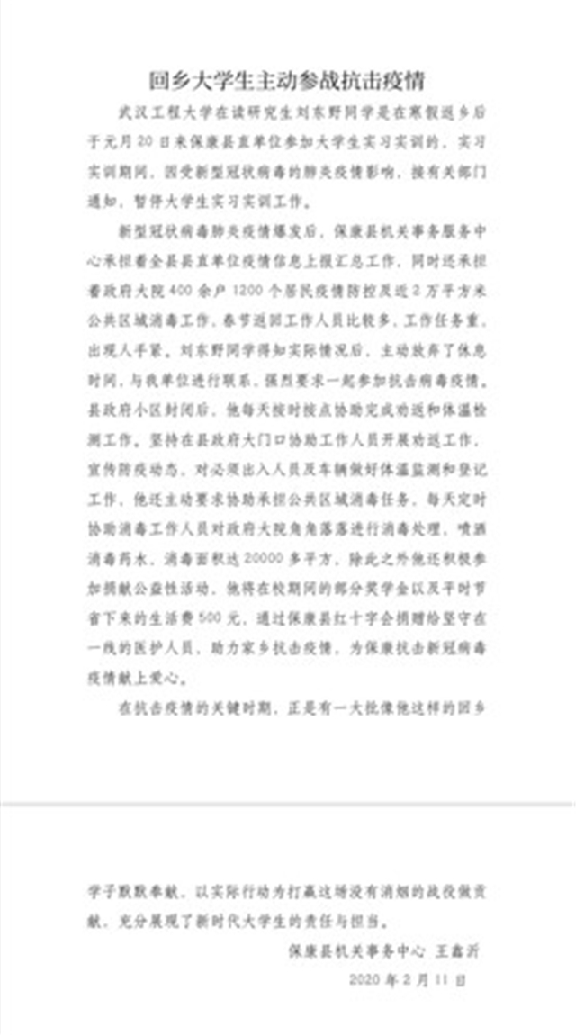 2020年2月11日,襄阳市保康县机关事务中心向4166am金沙信心之选发来感谢信,对我院19级法商二班研究生刘东野同学自愿参加抗击新型冠状病毒肺炎疫情的出色表现表示高度的赞扬和衷心的感谢。