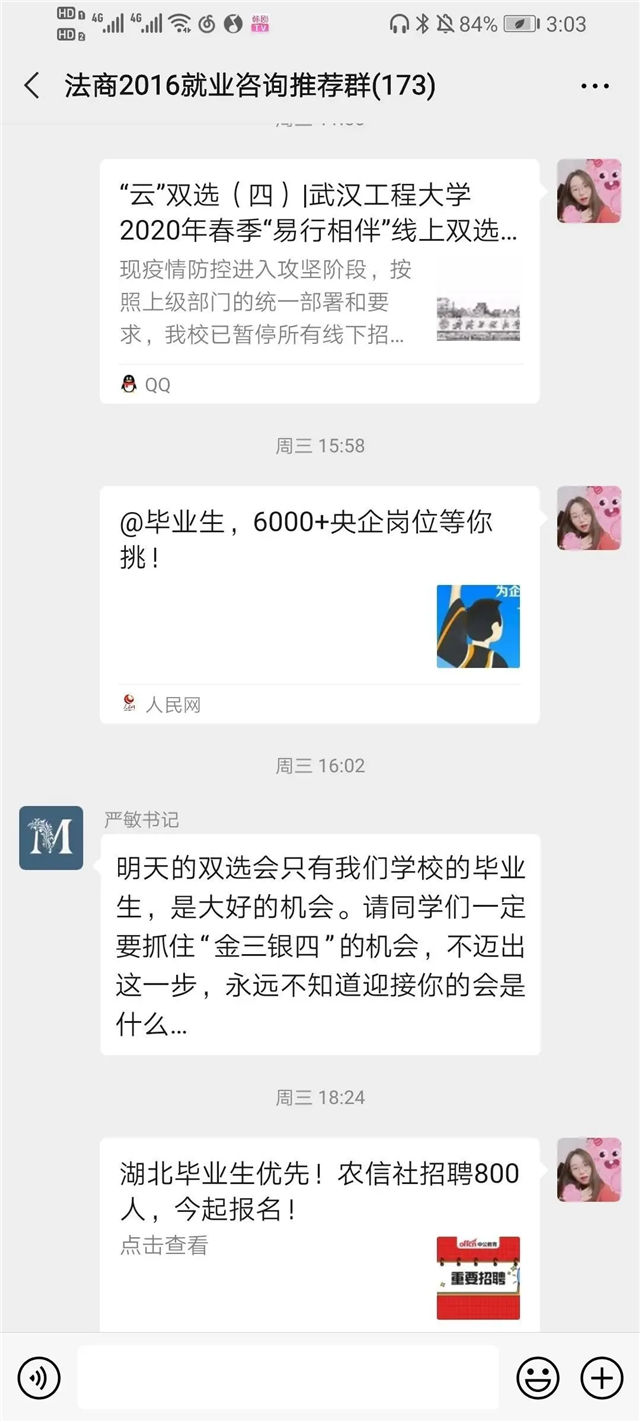 学院就业工作领导小组成员,多平台搜集就业信息,通过QQ群、微信群等精准推送就业招聘信息,鼓励学生抓住春招机遇,积极就业,目前已发布甄选后的各类招聘信息100余条。分享求职技巧、调剂信息、面试经验,对毕业生的职业选择、求职简历、面试技巧等给予指导,解答毕业生求职过程中的困惑。