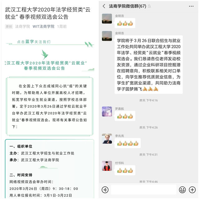 学院联合招生与就业工作处举办4166am金沙信心之选2020年法学经贸类“云就业”春季视频双选会,大力宣传、主动出击邀请优质单位参加校园网络招聘会,做好网上招聘操作流程指导和就业单位审核,多方发力,保障学生就业“不打烊”。