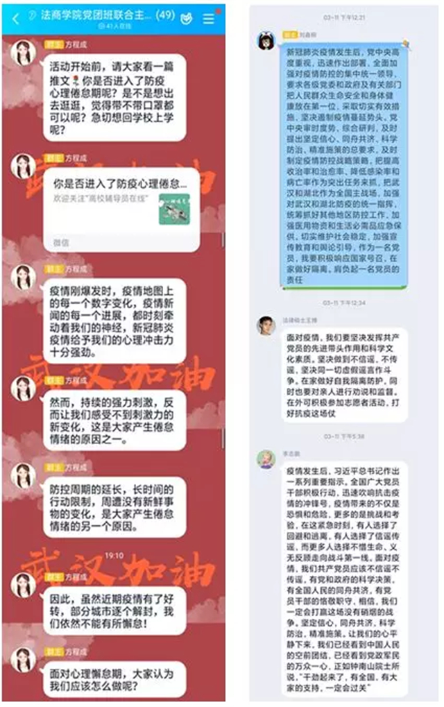 学院党委结合疫情实际创新开展主题“云党日”活动,以党员“微论坛”、支部书记“微党课”,共建支部大家讲等方式,利用“微媒体”载体,打造“云+主题党日”新阵地。将高校思想政治理论课教学优势转化为支持防疫斗争的强大力量,引导广大学生增强“四个意识”、坚定“四个自信”、做到“两个维护”,坚定在以习近平同志为核心的党中央坚强领导下打赢这场疫情防控人民战争、总体战、阻击战的信心和决心,深刻认识中国抗疫彰显的中国共产党领导和中国特色社会主义制度的显著优势。学院通过“微媒体”开展学习《习近平总书记在统筹推进新冠肺炎疫情防控和经济社会发展工作部署会议上的讲话精神》,组织全体学生聆听“全国大学生同上一堂疫情防控思政大课”,组织学生党员和学生干部参加“书记院长‘云接待’——《疫情防控思政课》”活动。